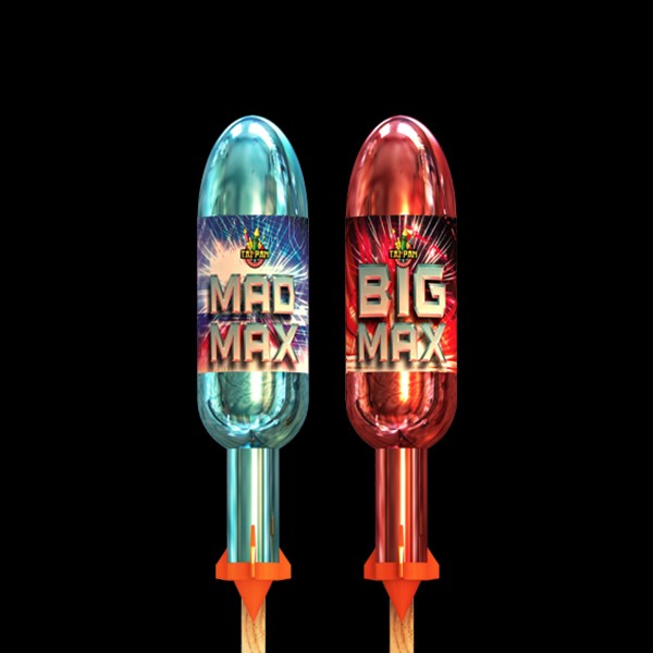 Mad Max and Big Max are not your average rockets. Crafted with proven professional display effects, these rockets guarantee an extraordinary performance that will leave you speechless.. The results speak for themselves as these rockets unleash an explosion of quality that is simply unparalleled.